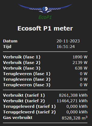 De Ecosoft P1-meter deelt de gegegens met apparaten in uw slimme netwerk via WiFi of (optioneel) ethernetverbinding. U kunt de gegevens ook bekijken in de webinterface van de P1-meter.