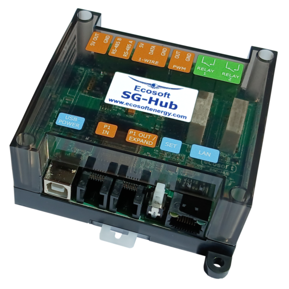 The Ecosoft SG-Hub is a smart switch with two relays, WiFi, ethernet and other connectors. The Hub is intended to control connected devices to save energy costs. It is suitable for among others heat pumps, hybrid heat pumps, heat pump boilers and PV-systems.